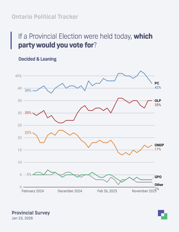 At the same time, there is a clear and growing desire for change in Ontario politics. The latest Liaison Strategies poll underscores this. It shows that “time for change” sentiment is rising, including among a meaningful share of Progressive Conservative voters themselves. Even more striking, the poll finds that a currently leaderless Ontario Liberal Party sits within roughly seven points of Ford’s PCs, close enough that a minority parliament is entirely plausible with the right campaign and vote distribution. The opportunity is real, but so is the risk of misreading it.
